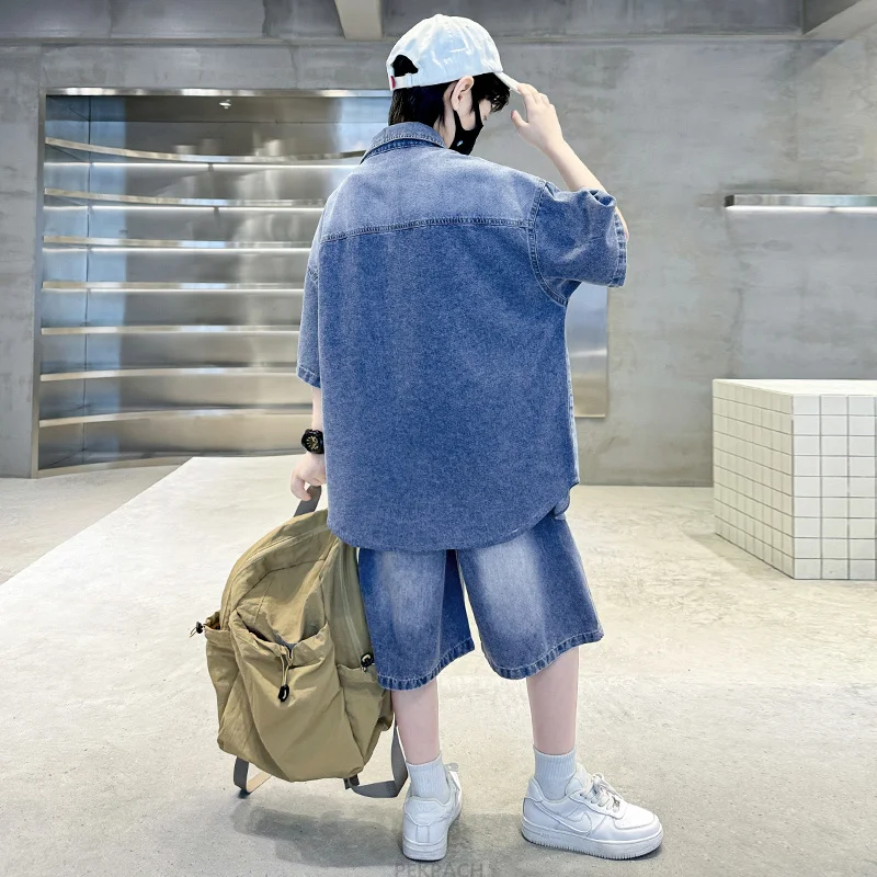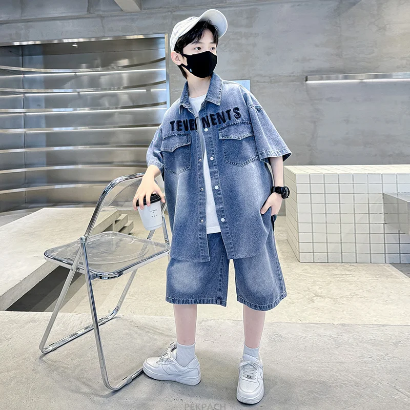 Boys Denim Suit Summer Clothes New Children's Short Sleeve Shirt + Shorts Sports Korean Tracksuit Sets Kids Luxury Clothing Suit - TopDealBox
