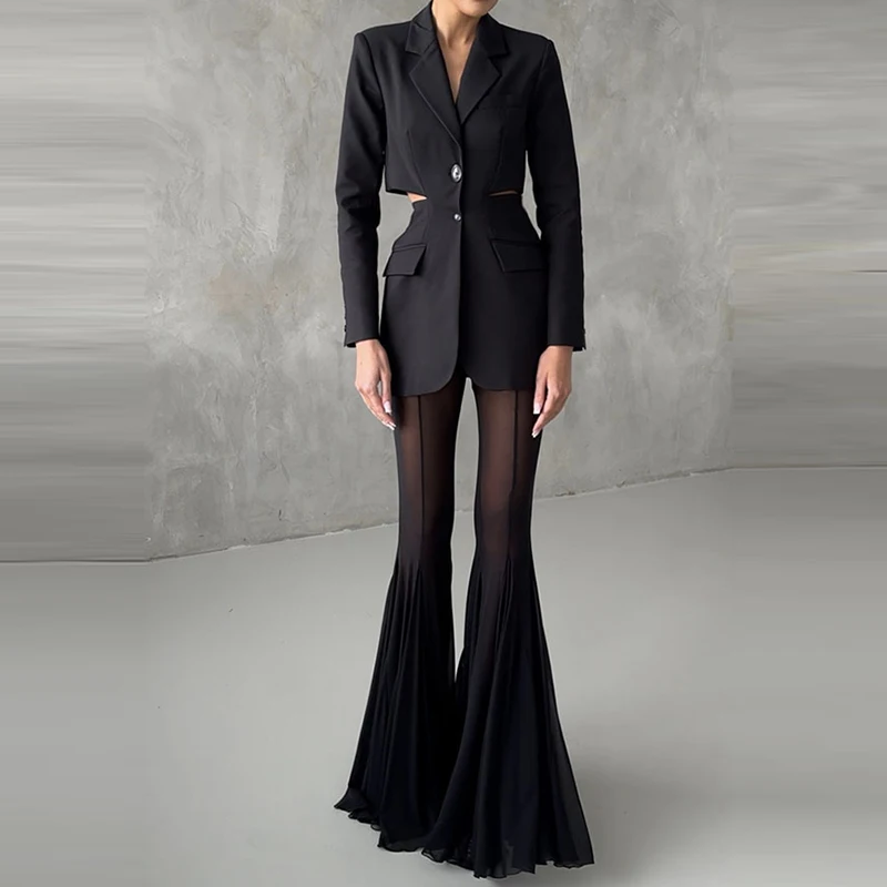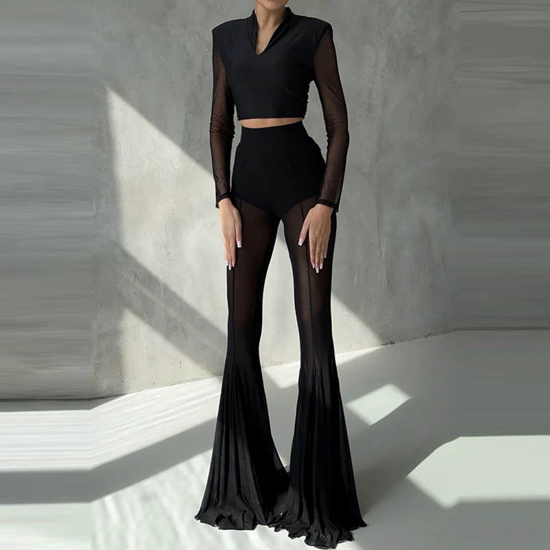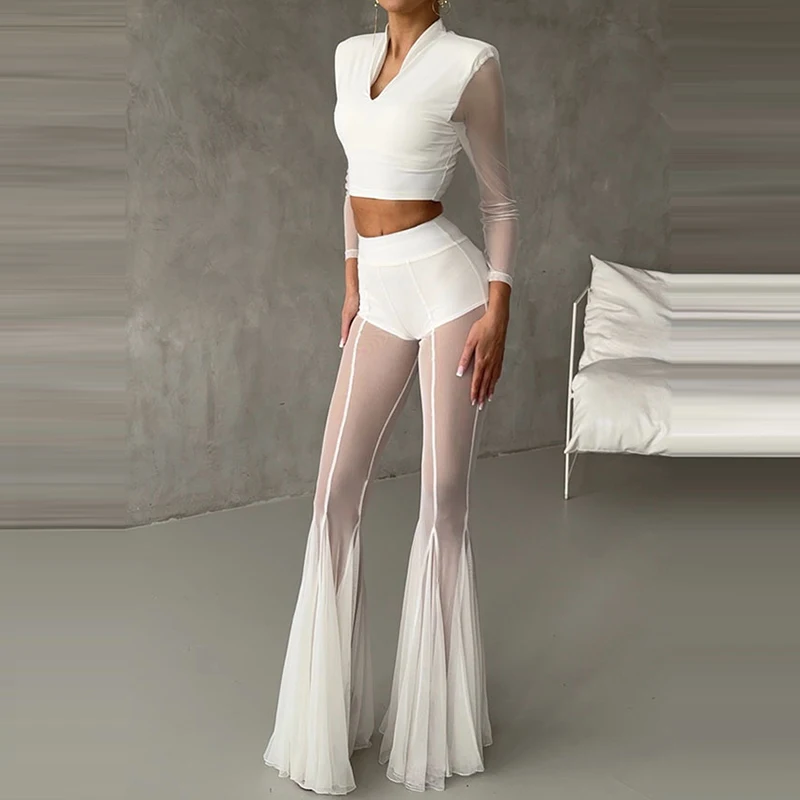 Elegant High Waist Slim Straight Trousers Sexy See Through Mesh Flare Pants for Women Summer Solid Commute Lady Long Pants Mujer - TopDealBox