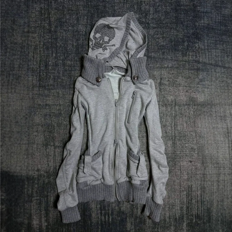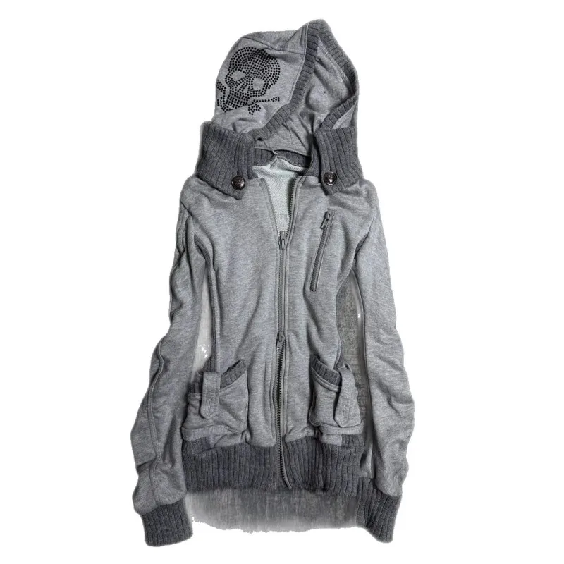 Gray Skull Rhinestone Hoodie Gothic Punk Zip Up Hooded Jacket Women Streetwear Fashion Trendy Casual Comfortable Soft Cotton Hoo - TopDealBox