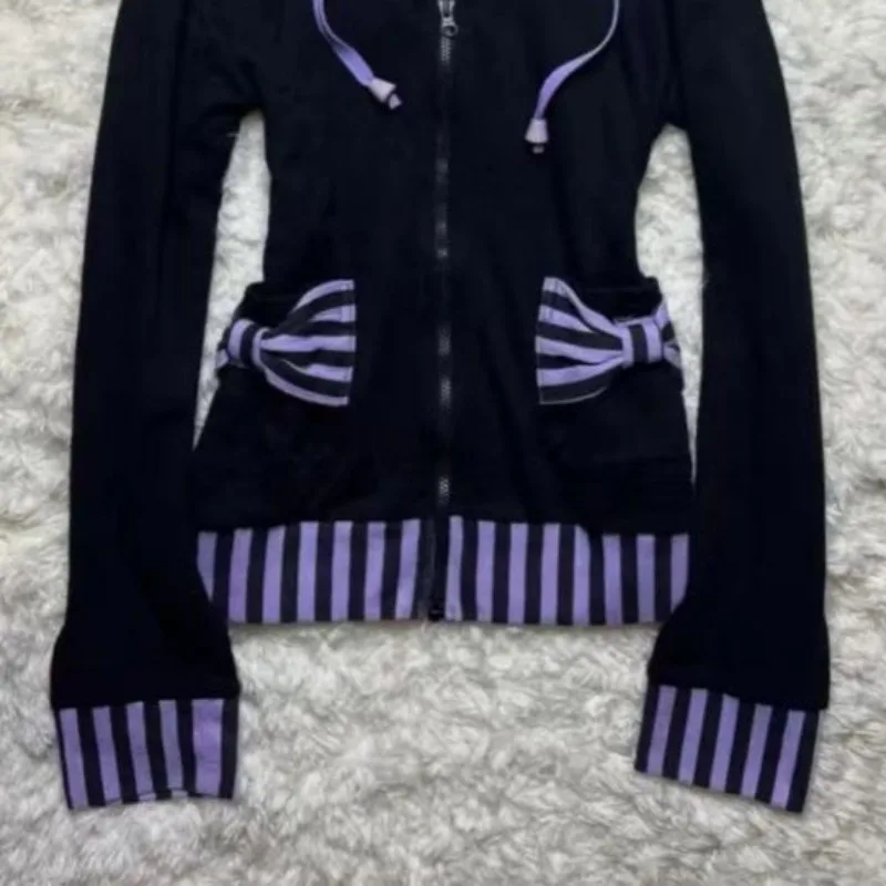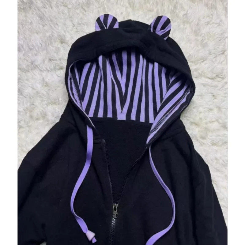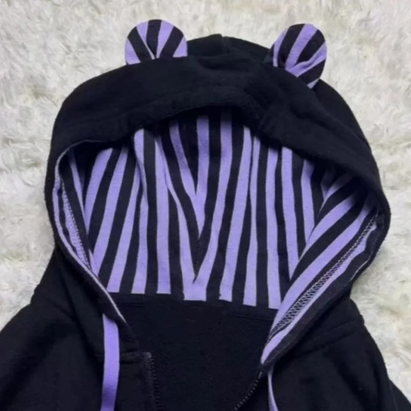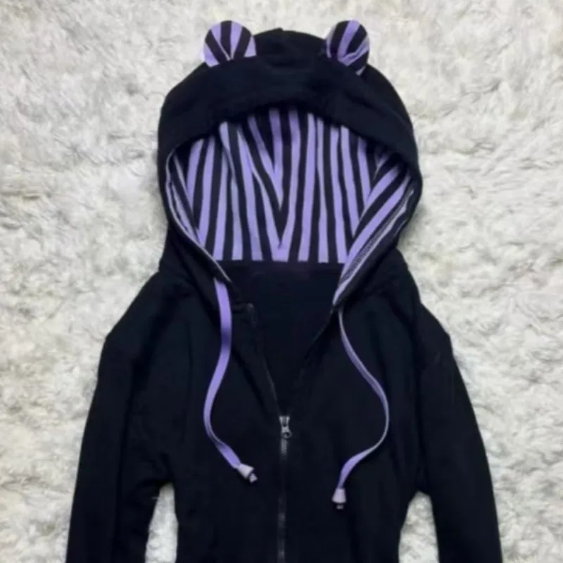 Kimutomo Hoodies Women Striped Zipper Bow Drawstring Ears Autumn New Fashion Grunge Long Sleeve Sweatshirt Ladies Y2k Harajuku - TopDealBox