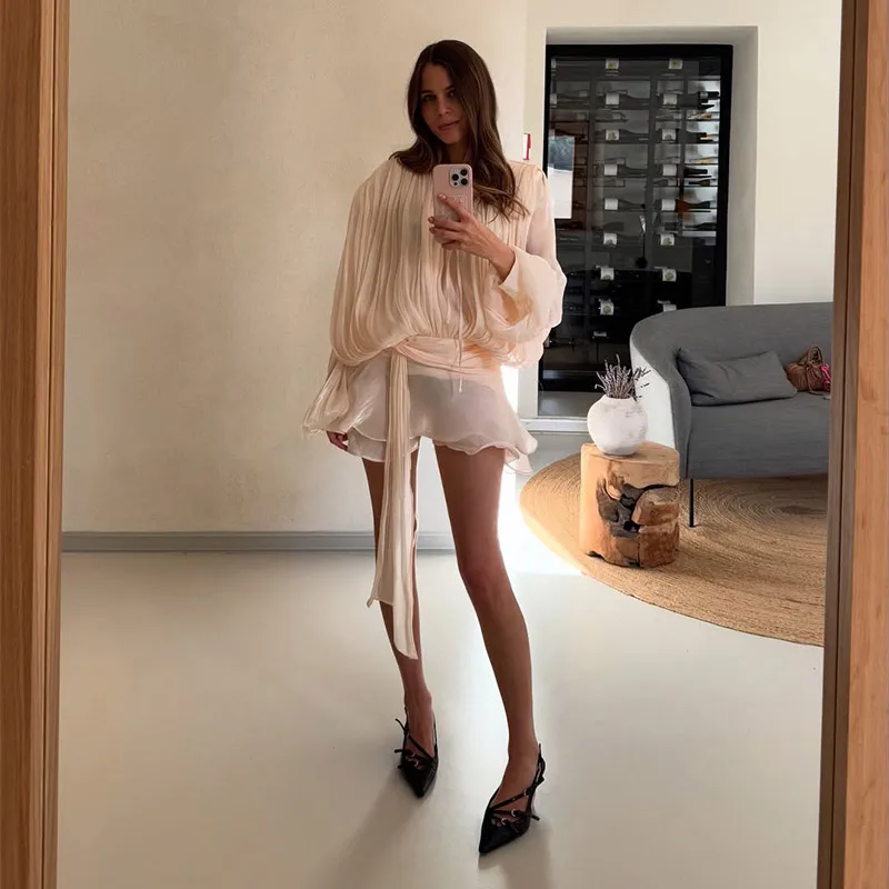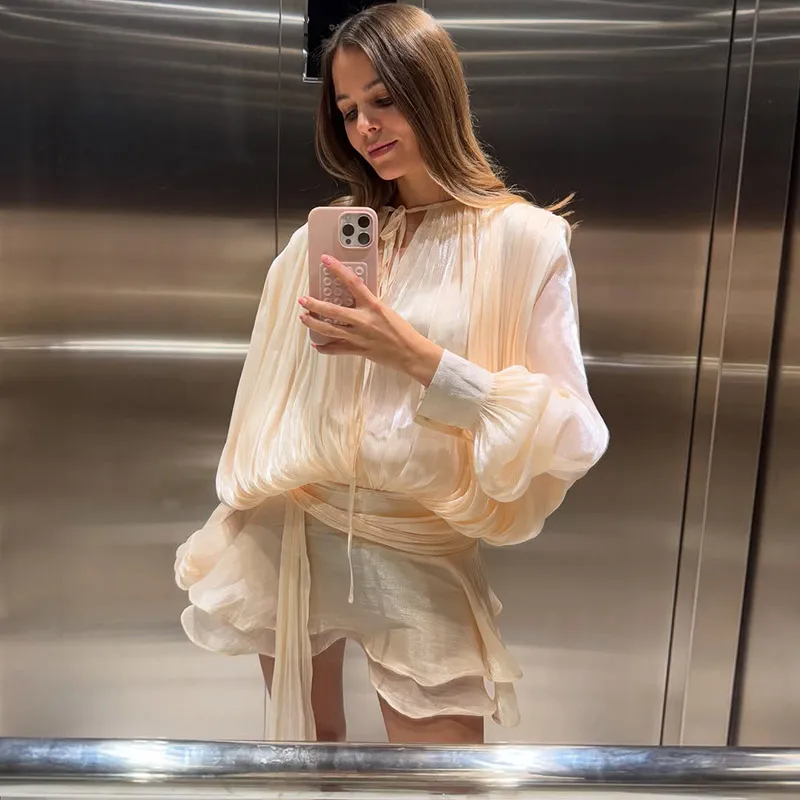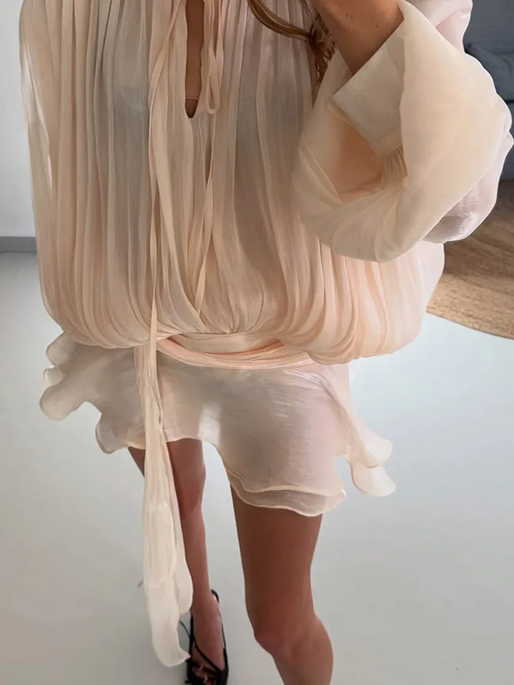 Stunning Shiny Ruffles Lace Up Mini Dress Chic Loose Hollow Out A-line Pleated Vestidos Lady Summer Party Gowns 2026 Spring New - TopDealBox