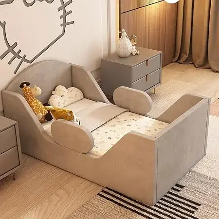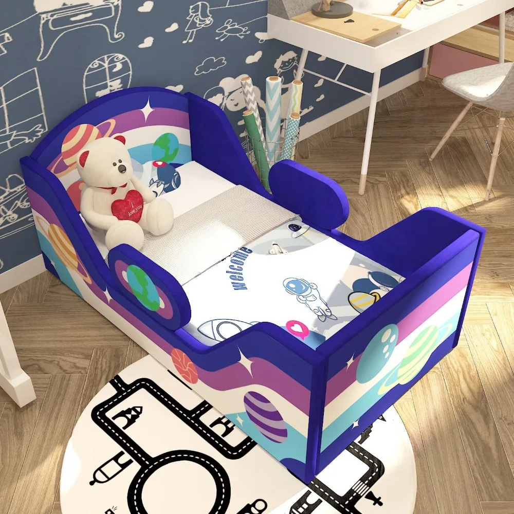 Toddler Bed Round With Rail And Headboard Standard Crib Size Upholstered Bed For Children 18 Months Plus - TopDealBox